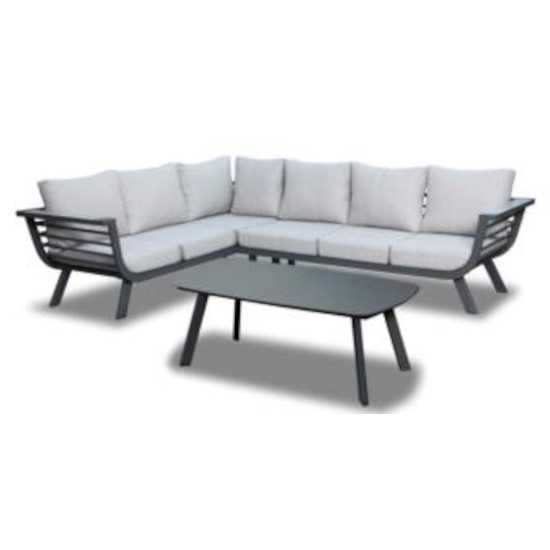 סט PRATO פינתי לבן + כריות אפורות + שולחן אלומיניום לבן